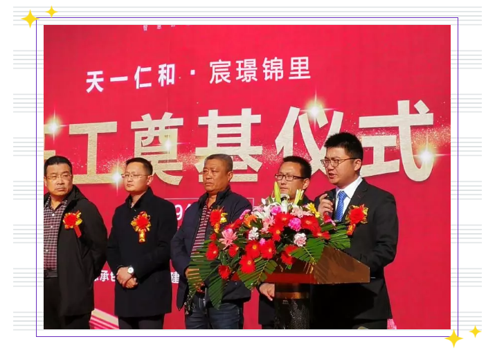 奠基仪式开始前,天一仁和房地产集团烟台项目总经理肖总进行致辞,肖总表示作为天一仁和集团进驻烟台首个项目,集团抱有必胜的信心和十足的把握,建设过程中将狠抓细节,用一流的设计、一流的施工、一流的监理、一流的管理,缔造出一流品质,用五个一的工程品质为业主打造皇家风范园林般的生活居所。