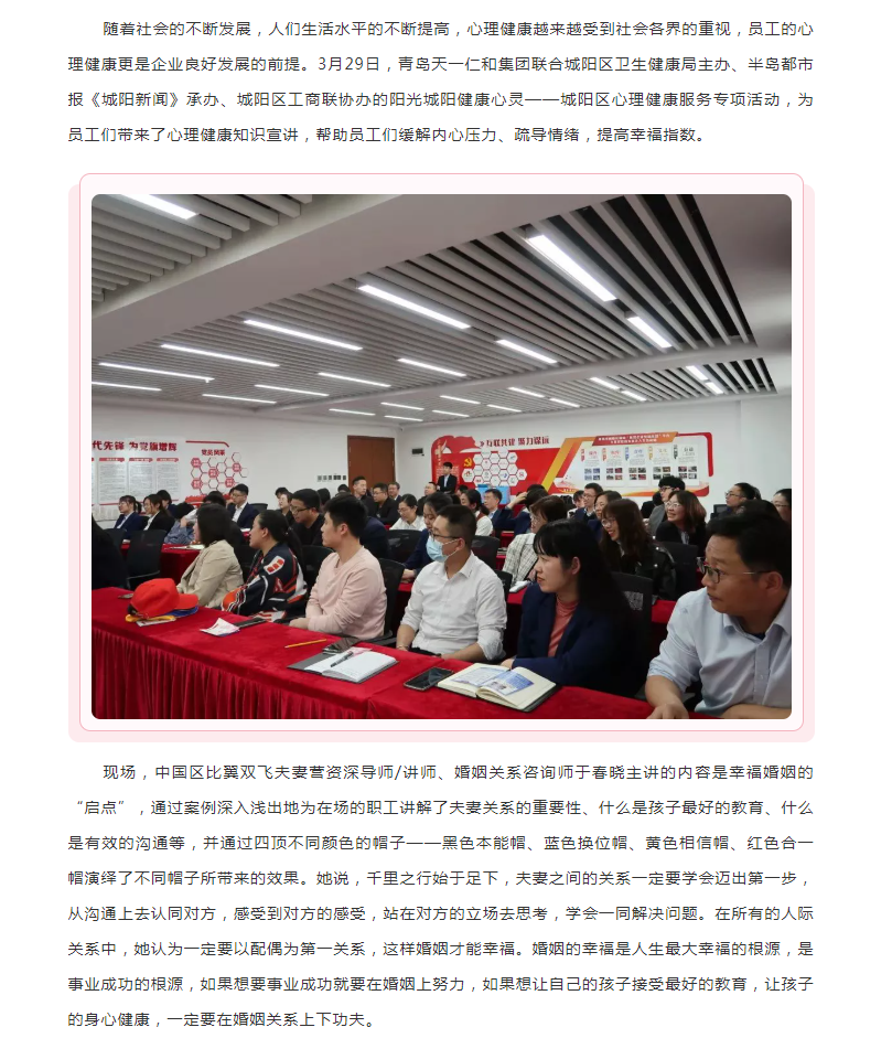 守护员工心理健康“不掉队”——城阳区首场企业心理健康辅导讲座在天一仁和集团圆满结束