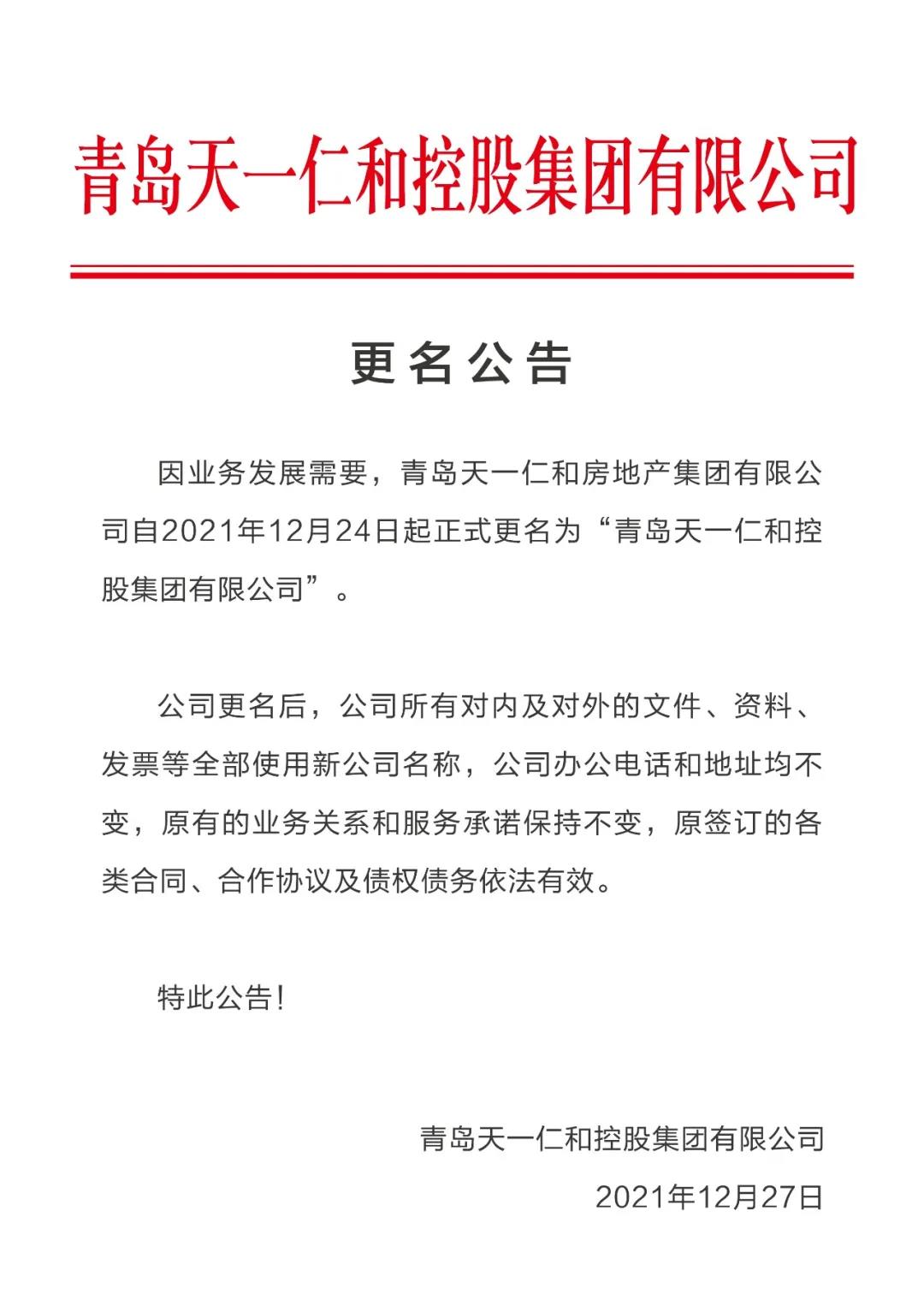 自2021年12月24日起,公司名称已由“青岛天一仁和房地产集团”更改为“青岛天一仁和控股集团有限公司”。(以下简称天一仁和集团)