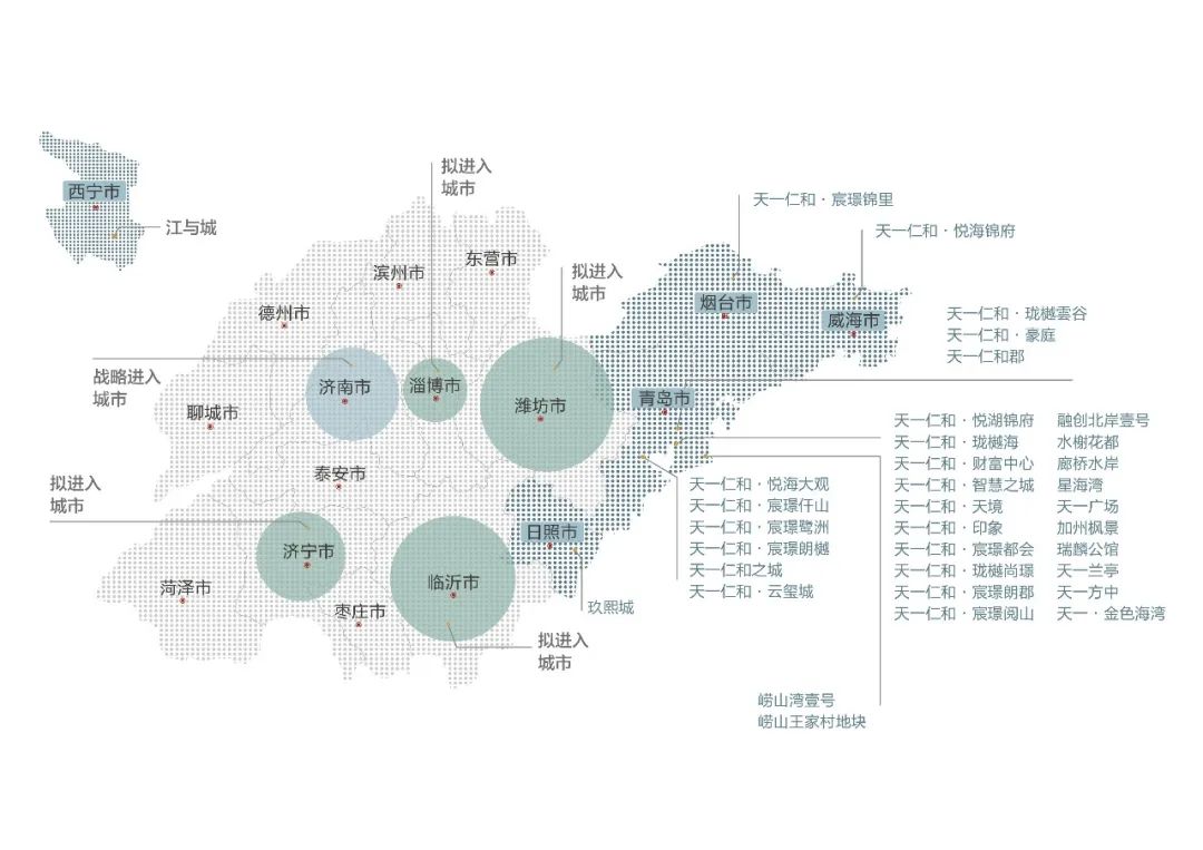 2021年,集团在建项目22个,同期开发面积300万㎡。2020年销售额超60亿,销售面积超40万㎡,累计储备货值320亿元,包括青岛市重点建设项目——天一仁和财富中心、天一仁和珑樾海、天一仁和珑樾尚璟以及高新区产业项目天一仁和宸璟都会等;山东省其他地区烟台、威海、日照项目均处于城市绝佳地段:其中日照与国企城投、东华软件合作“玖熙城”项目位于大学城。青海省西宁市与中海外合作的“江与城”项目位于河湟新区,是第一个布局省外的青岛本土房企。