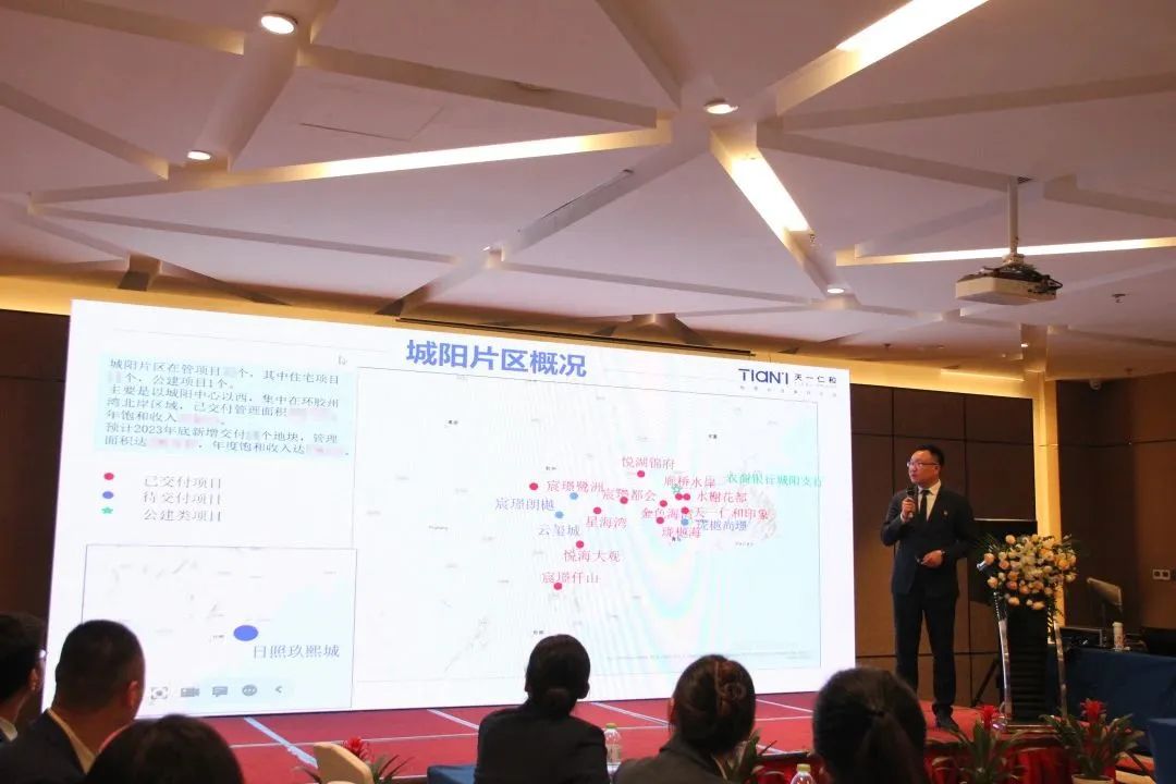 物业公司片区总监、各小区项目经理及案场经理,借助多媒体手段,以图文并茂的形式总结了2022年度的项目完成情况,对工作不足之处进行了剖析,并对2023年度工作进行了规划展望。